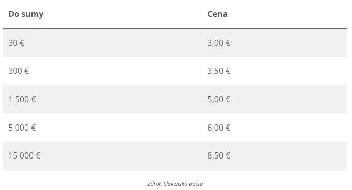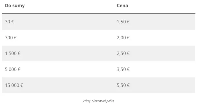 Pomocou poštového poukazu možno poslať až 15-tisíc eur. Poplatky závisia od posielanej sumy. Čím viac peňazí chce niekto poslať, tým bude aj poplatok vyšší.